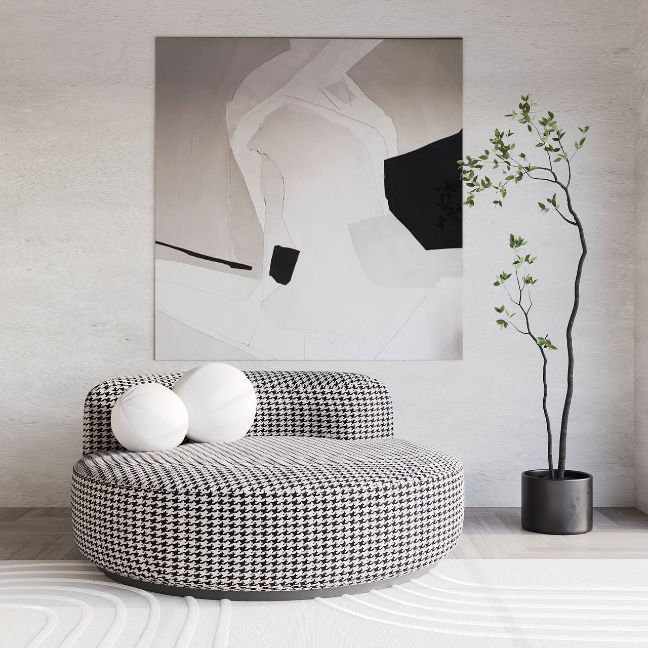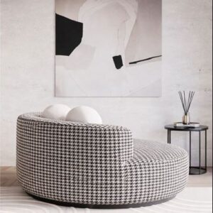 The Houndstooth Curve Lounge Sofa is a striking blend of modern form and classic pattern. Designed with a smooth, rounded silhouette and a low, curved backrest, this sofa offers exceptional comfort and visual appeal. Upholstered in premium black-and-white houndstooth fabric, it adds a bold yet elegant character to contemporary interiors. The wide, cushioned seat provides a relaxed lounging experience, while the solid base ensures stability and durability. Ideal for living rooms, lounges, or designer spaces, this sofa makes a sophisticated statement in any setting.