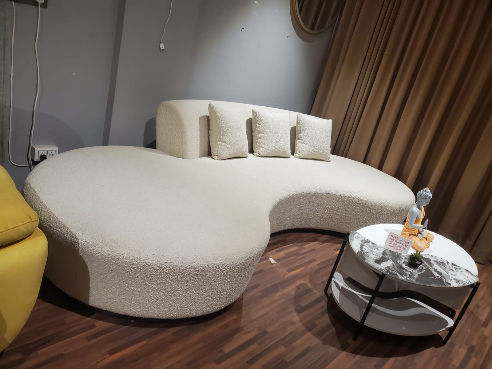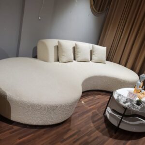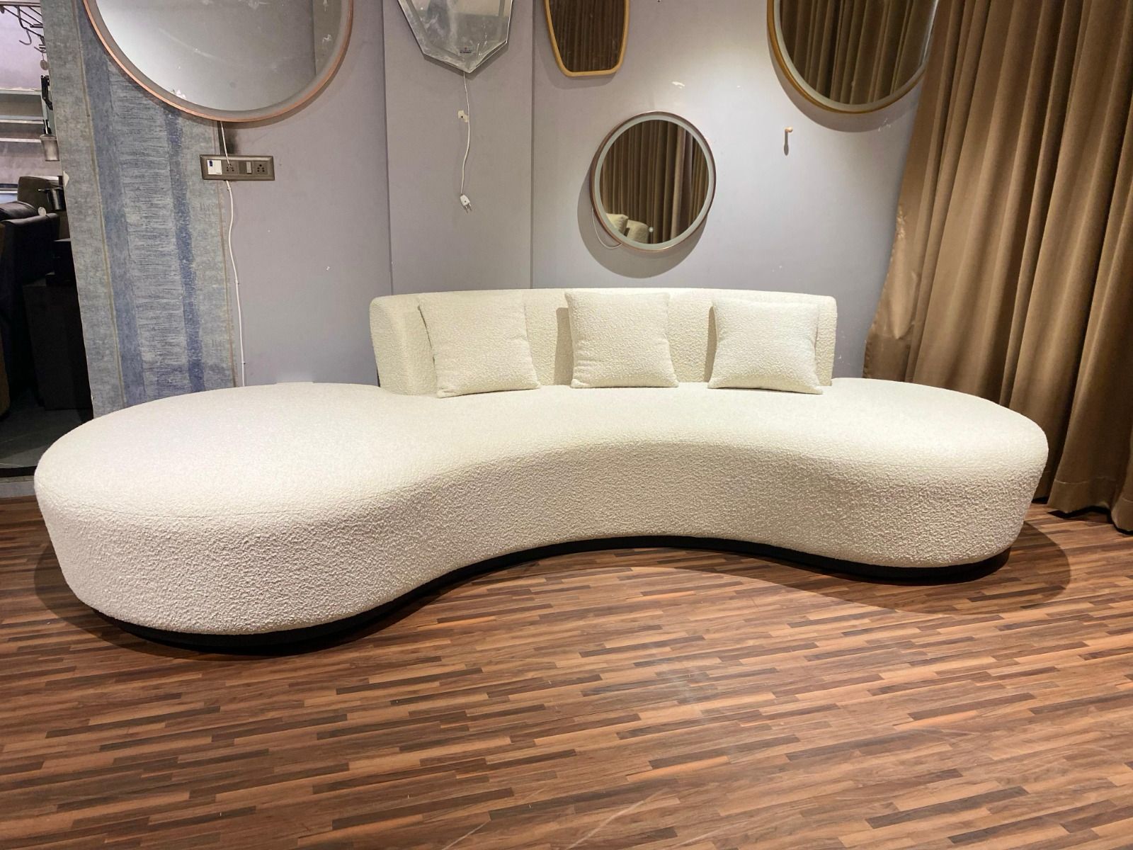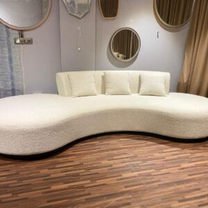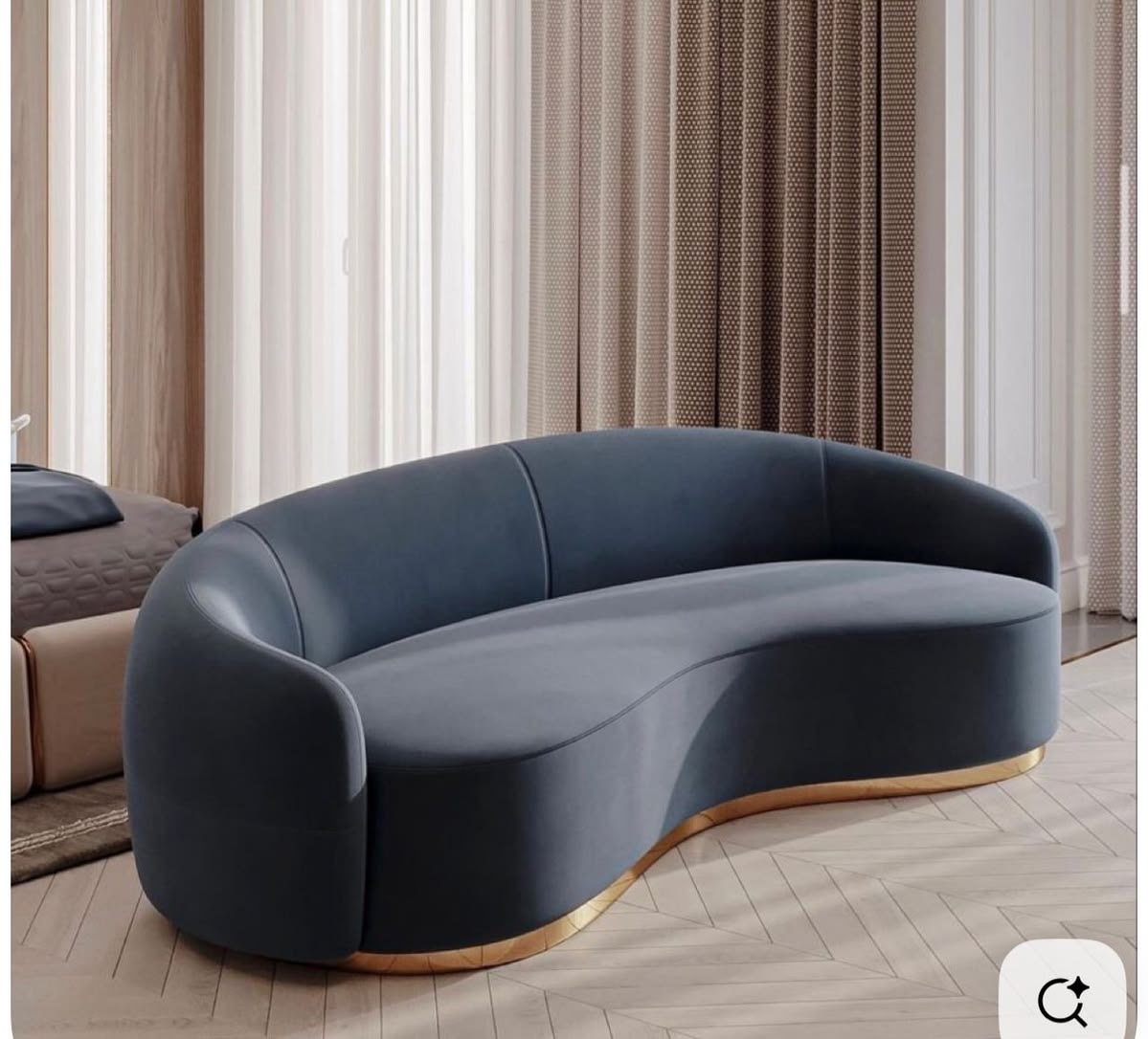 This sophisticated, crescent-shaped sofa acts as a striking centerpiece for any modern living space, seamlessly blending Art Deco elegance with contemporary organic design. Upholstered in a rich, slate-blue velvet, the plush fabric offers a luxurious tactile experience and deep, inviting color.